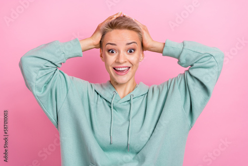 Photo portrait of lovely young lady arms touch head excited cant believe dressed stylish khaki outfit isolated on pink color background