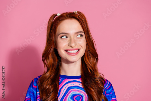 Photo portrait of lovely young lady interested look empty space dressed stylish blue colorful garment isolated on pink color background
