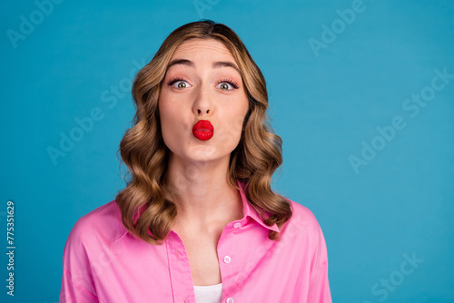 Photo portrait of lovely young lady kiss you pouted lips dressed stylish pink garment hairdo isolated on blue color background