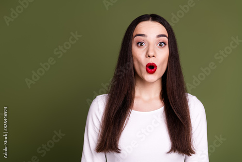 Photo portrait of lovely young lady scared face reaction dressed stylish white garment isolated on khaki color background