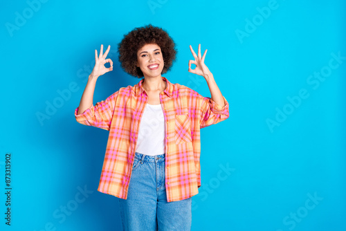Photo portrait of lovely young lady show okey approve dressed stylish checkered garment isolated on blue color background