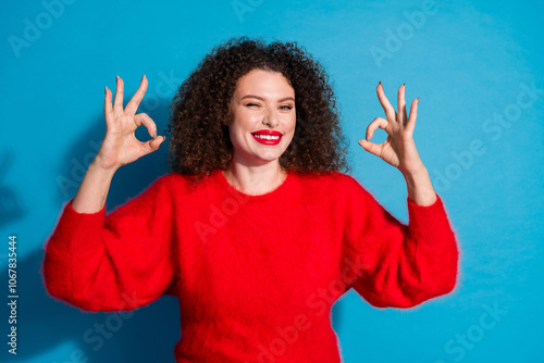 Photo portrait of lovely young lady wink show okey approve dressed stylish red garment isolated on blue color background