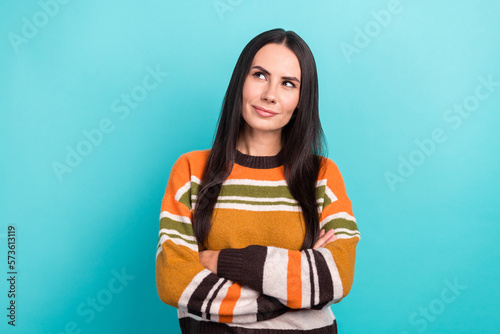 Photo portrait of minded brainstorming young woman folded hands looking empty space suspicious proposition isolated on blue color background