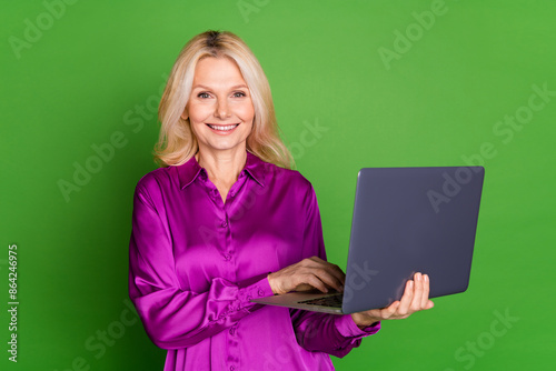 Photo portrait of nice senior female hold netbook wear trendy violet satin outfit isolated on green color background