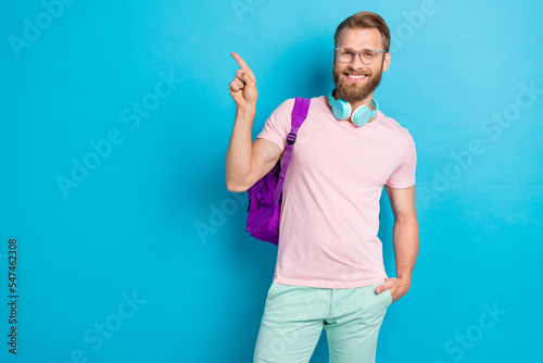 Photo portrait of nice young man eyewear rucksack point empty space shopping wear trendy pink garment isolated on cyan color background