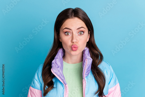 Photo portrait of pouting woman isolated on pastel blue colored background