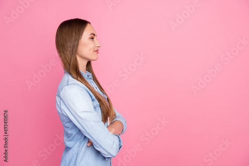 Photo portrait of pretty young girl profile confident pose empty space dressed stylish denim outfit isolated on pink color background