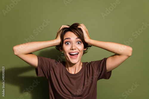 Photo portrait of pretty young girl touch head excited cheerful dressed stylish brown outfit isolated on khaki color background