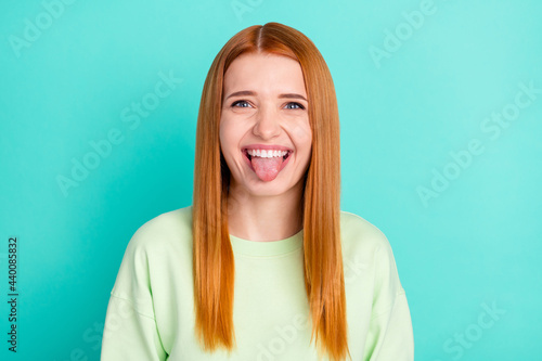 Photo portrait of showing tongue red haired girl smiling isolated on bright teal color background