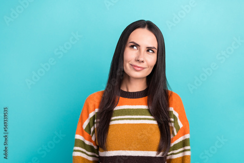 Photo portrait of thoughtful adorable woman brunette long hair wear stylish striped sweater look mockup eureka isolated on cyan color background