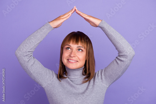 Photo portrait of woman making roof over head with hands isolated on bright colored background