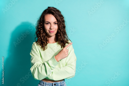 Photo portrait of woman pointing finger at blank space isolated on vivid turquoise colored background