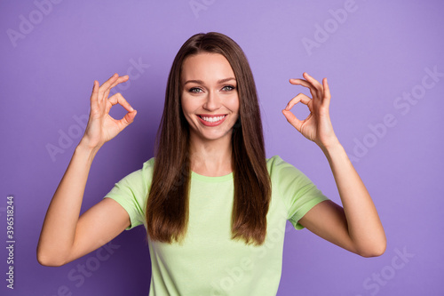 Photo portrait of woman showing two ok-signs isolated on vivid violet colored background
