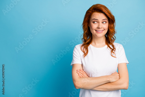 Photo portrait of woman with folded arms looking at blank space isolated on pastel blue colored background