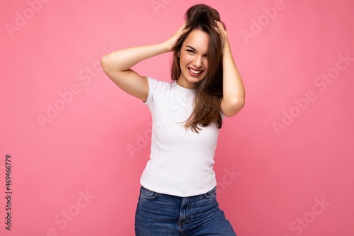 Photo portrait of young beautiful smiling hipster brunette woman in white t-shirt with mockup. Sexy carefree female person posing isolated near pink wall with empty space in studio. Positive model