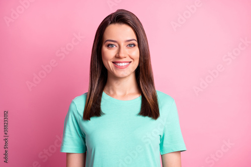 Photo portrait of young cheerful girl smiling wearing teal t-shirt isolated on pastel pink color background