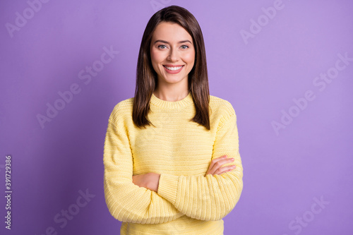 Photo portrait of young happy pretty girl smiling with crossed hands wearing yellow clothes isolated on vibrant violet background
