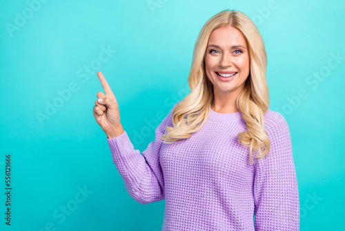 Photo portrait of young smiling good mood blonde wavy hairstyle girl wear purple jumper direct finger mockup news isolated on cyan color background