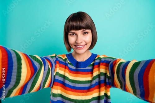 Photo portrait smiling bob haired woman in casual clothes taking selfie isolated bright teal color background