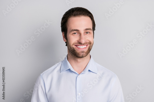 Photo portrait smiling confident businessman wearing white shirt isolated grey color background