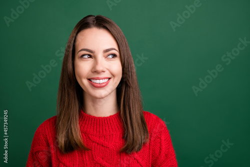 Photo portrait smiling girl wearing knitted sweater looking copyspace isolated green color background