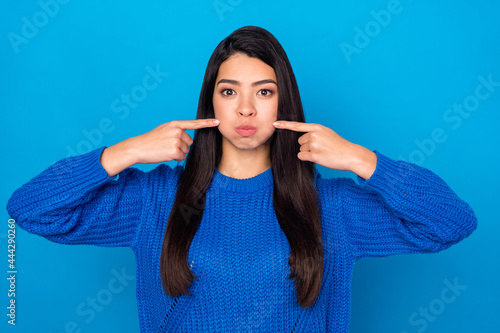 Photo portrait young girl playful touching cheeks holding breath isolated vibrant blue color background