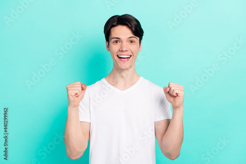 Photo portrait young guy wearing white t-shirt gesturing like winner isolated bright teal color background