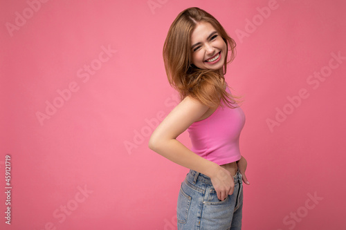 Photo shot of pretty joyful smiling young female person wearing casual trendy outfit standing isolated on colourful background with copy space looking at camera and having fun