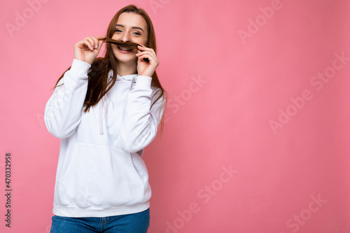 Photo shot of pretty joyful smiling young female person wearing casual trendy outfit standing isolated on colourful background with copy space looking at camera and having fun and playing with hair