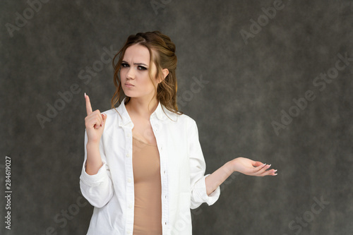 Photo waist-length portrait of a pretty brunette woman girl with long beautiful curly hair on a gray background in a white shirt. Talking in different poses. Standing facing the camera.