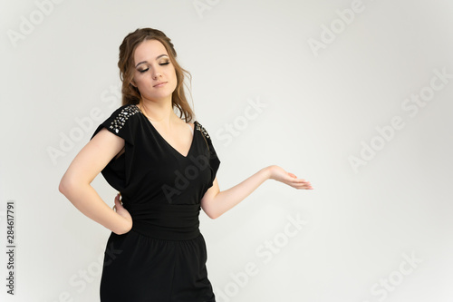 Photo waist-length portrait of a pretty brunette woman girl with long beautiful curly hair on a white background in a black dress. Talking in different poses. Standing facing the camera.
