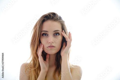 Photograph of a portrait of a beautiful fashionable beauty woman girl with long dark flowing hair, isolate on a white background. She is standing in different poses and smiling.
