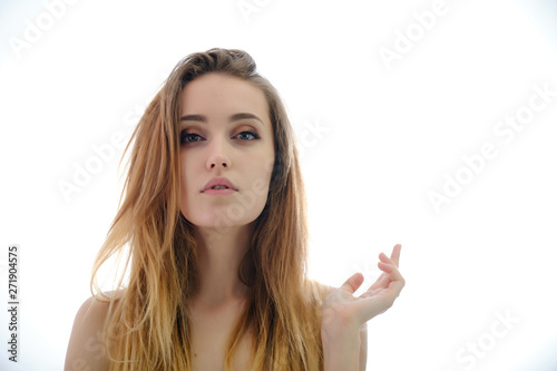 Photograph of a portrait of a beautiful fashionable beauty woman girl with long dark flowing hair, isolate on a white background. She is standing in different poses and smiling.