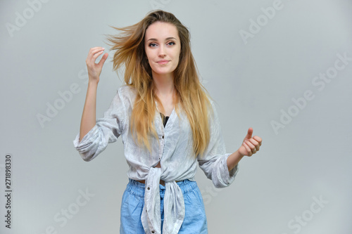 Photograph of a portrait of a beautiful girl woman with long dark flowing hair, satisfied life on a gray background. She stands in front of the camera in different poses with different emotions.