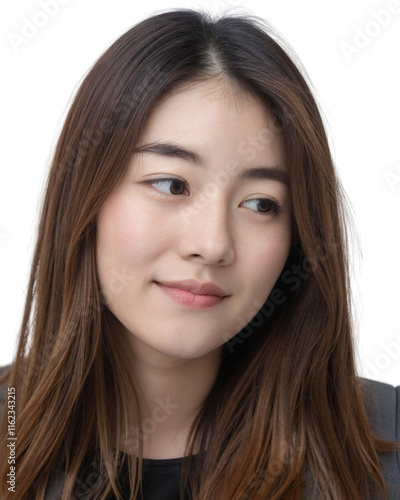 Photograph of an Asian woman with long brown hair, wearing a black jacket, against a plain white background.