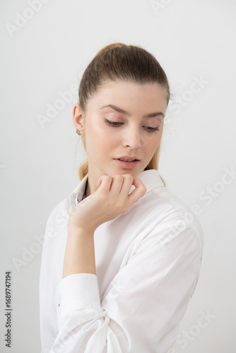Photograph of beautiful young woman with clean perfect skin in white shirt posing on white background. Portrait of beauty model with natural nude make up. Spa, skincare and wellness. Close up
