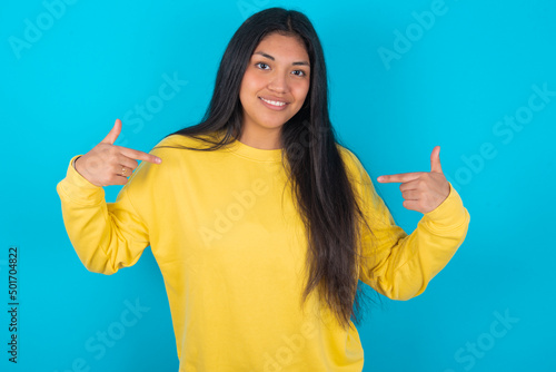 Pick me! Confident, self-assured and charismatic young latin woman wearing yellow sweater over blue background promoting oneself as wanting role smiling broadly and pointing at body.