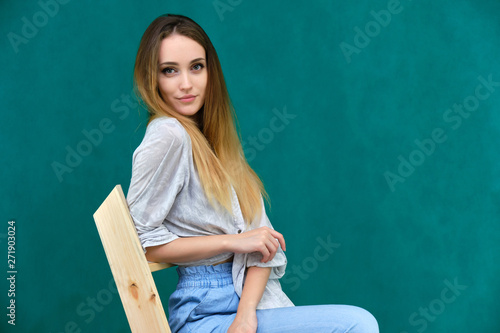 Picture a portrait of a beautiful girl woman with long dark flowing hair, fashionable, on a green background sitting on a wooden staircase. She sits in different poses and smiles.