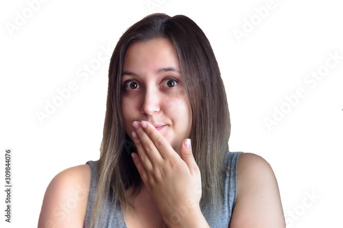 picture of amazed brunette girl with hand over mouth isolated over white background