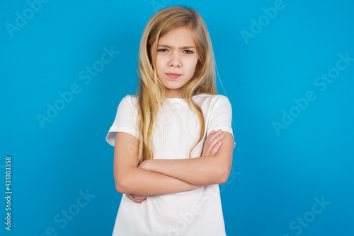 Picture of angry beautiful Caucasian little girl wearing white T-shirt over blue background crossing arms. Looking at camera with disappointed expression.