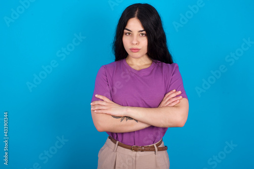 Picture of angry young beautiful tattooed girl wearing purple t-shirt looking camera.