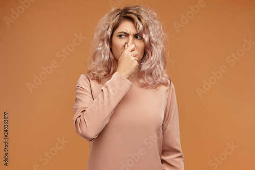 Picture of emotional displeased young European woman pinching her nose because of bad smell or gross stink. Stylish teenage girl can't stand dirty socks odour, holding breath. Body language