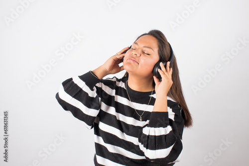 picture of latin woman listening to music on large wireless headphones. Concept of people and technology.