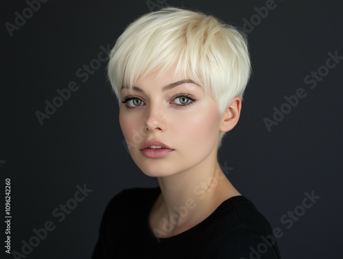 Pixie haircut, platinum blonde hair, asymmetrical bangs, natural makeup, edgy style, realistic, dramatic lighting
