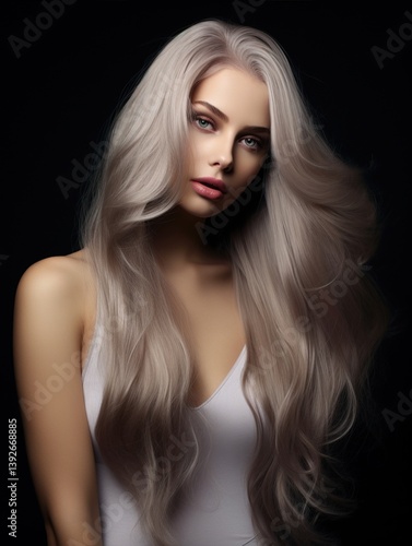 Platinum blonde model posing with windswept, lustrous hair, wearing white top against minimalist gray studio backdrop