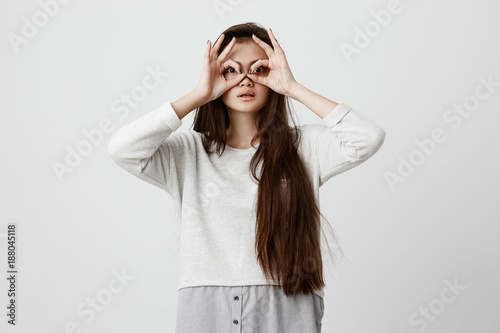 Playful excited teenage female with dark long hair showing Ok gestures with both hands, pretending to wear spectacles, astonished to see something amazing. Emotions, body language and gestures