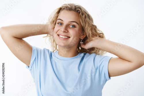 Playful, feminine attractive european woman with short blond curly hairstyle holding hands behind head as combing hair smiling joyfully and gazing at camera carefree and relaxed over white background