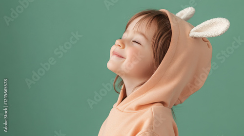 Playful French 4-year-old with bunny ears hoodie on soft green background for Easter celebration