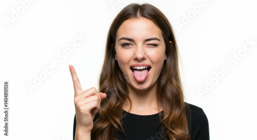 Playful Young Woman Winking and Pointing on White Backdrop for Simple Portrait