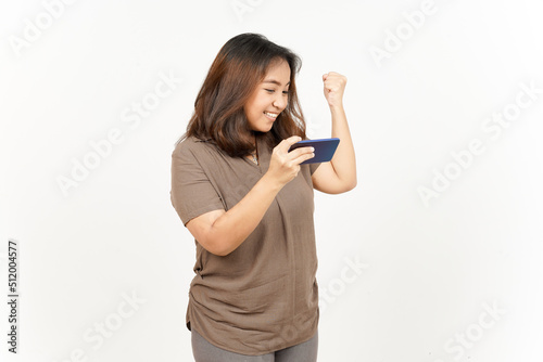 Playing Mobile Game on Smartphone of Beautiful Asian Woman Isolated On White Background